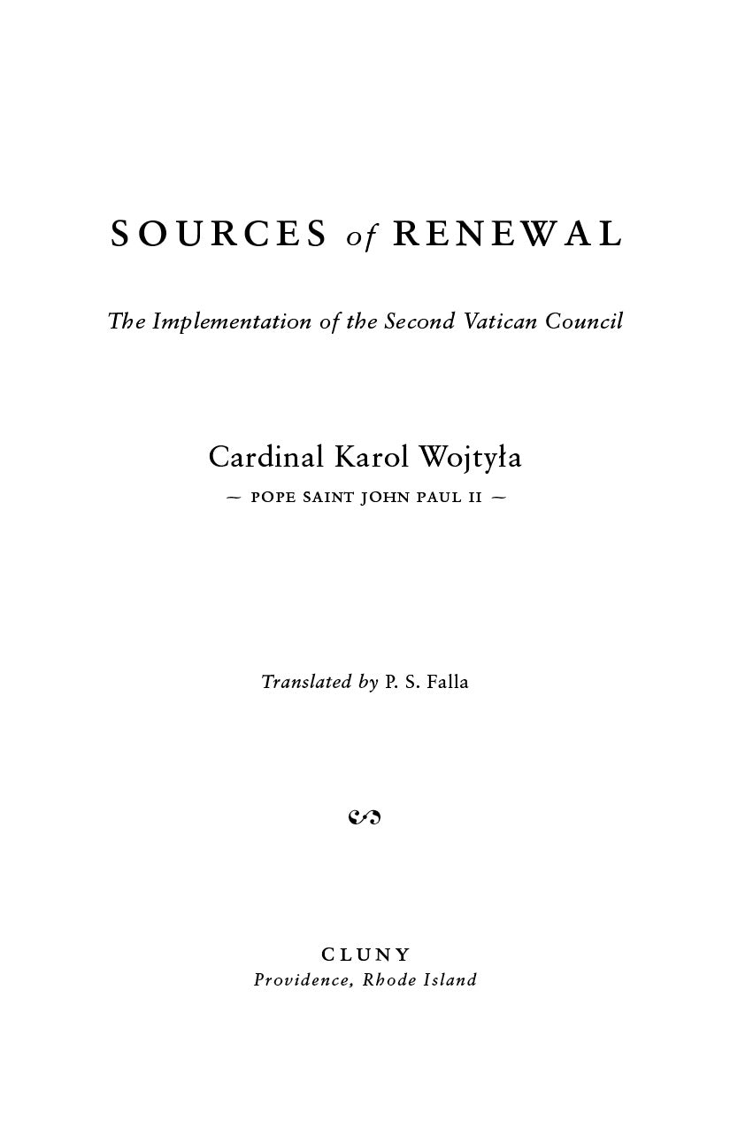 Sources of Renewal is Karol Wojtyła’s intense study of the Second Vatican Council’s documents and his ambitious vision of how the Council might best be implemented. Initially published in 1972 and revised after Wojtyła’s election to the papacy, Sources of Renewal lays out the foundation for how Wojtyła, first as Archbishop of Kraków and then as Pope, sought to translate the constitutions, decrees and declarations of Vatican II into the faith and life of the Church. This translation and implementation, he comments, ought to be considered as “the response of faith to the word of God as it proceeded from that Council.… The teaching of Vatican II stands revealed as the image, proper to our time, of the Church’s self-realization.” To this end, Sources of Renewal quotes copiously and studies closely the documents of Vatican II with the intent of answering firmly those questions which press upon all the baptized: What does it mean to be a Christian, to live in the Church and in the modern world?