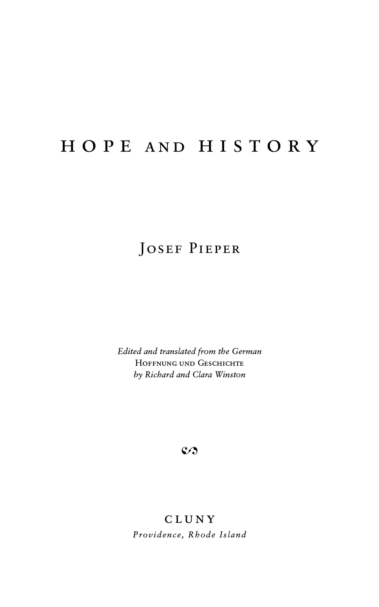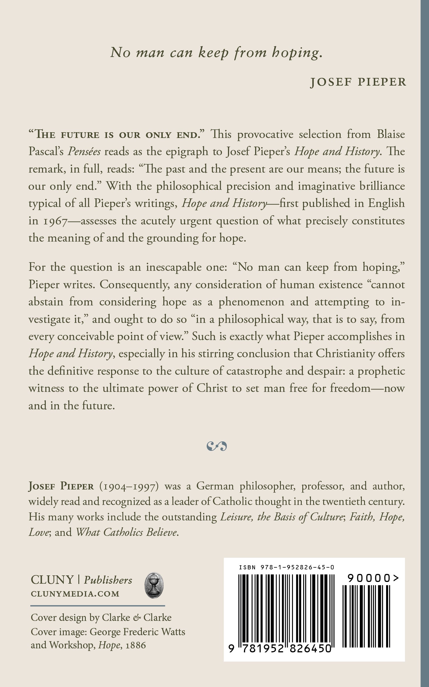 “The future is our only end.” This provocative selection from Pascal’s Pensées reads as the epigraph to Josef Pieper’s 1967 Hope and History. The remark, in full, reads: “The past and the present are our means; the future is our only end.” With the philosophical precision and imaginative brilliance typical of all Pieper’s writings, Hope and History assesses the acutely urgent question of what precisely constitutes the meaning of and the grounding for hope.