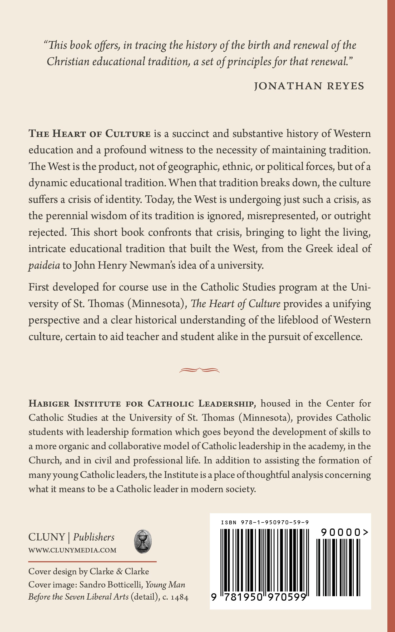 The Heart of Culture is a succinct and substantive history of Western education and a profound witness to the necessity of maintaining tradition. The West is the product, not of geographic, ethnic, or political forces, but of a dynamic educational tradition. When that tradition breaks down, the culture suffers a crisis of identity. Today, the West is undergoing just such a crisis, as the perennial wisdom of its tradition is ignored, misrepresented, or outright rejected. This short book confronts that crisis, bringing to light the living, intricate educational tradition that built the West, from the Greek ideal of paideia to John Henry Newman’s idea of a university.
